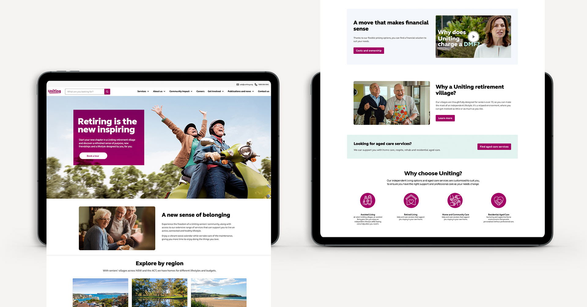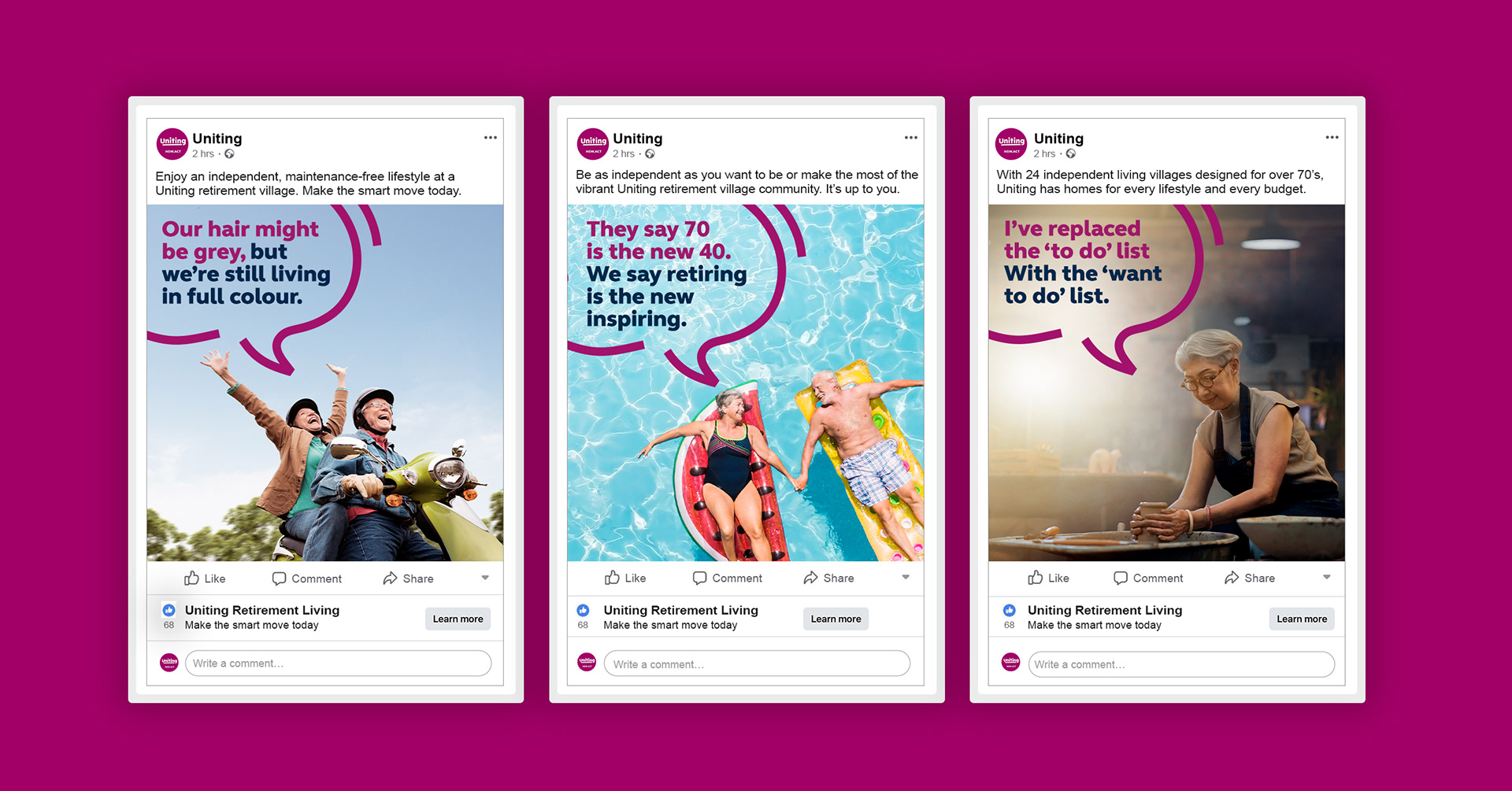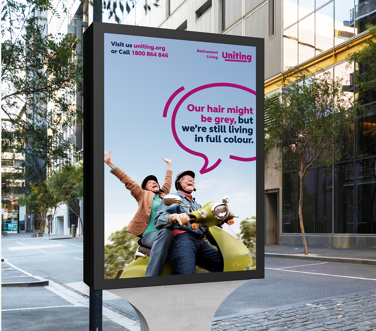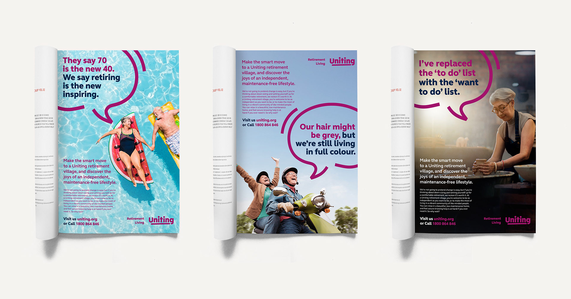 Retirement and independent living facilities are no longer a loss of independence or a sign of aging. At Uniting, their retirement living packages enable retirees to experience the flexibility of a maintenance free lifestyle, allowing residents to have more time to enjoy doing the things they love. The campaign was developed from the insight that retirees are as active and vital and switched on as ever. Uniting helps to facilitate seniors to be surrounded by a like-minded community, along with access to on site amenities with increased safety and security. From a creative standpoint, it was about emotionalising the brand to create a lasting connection with the audience, showing a state of contentment, wellbeing and sense of community that can come from the next stage of life.