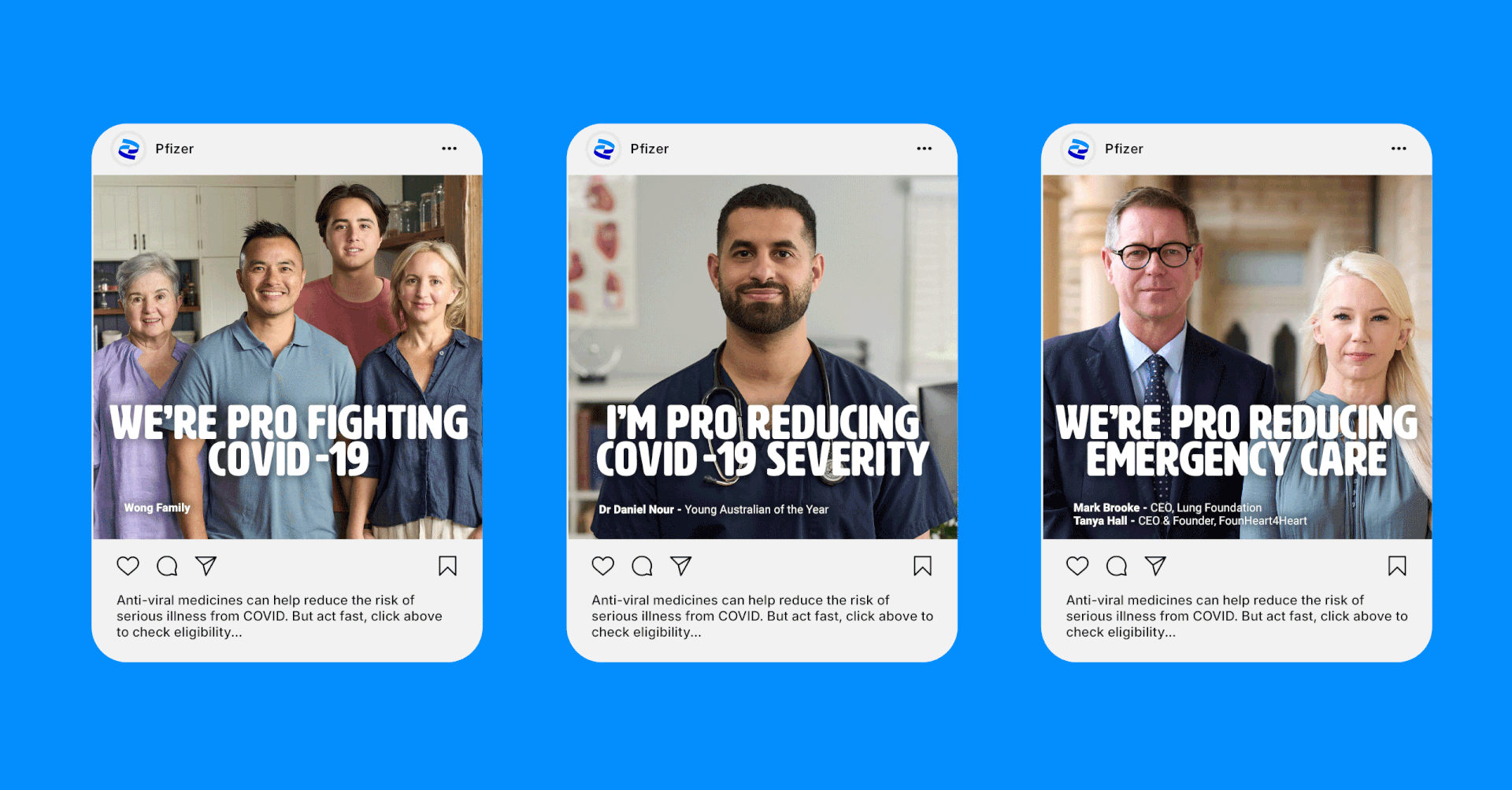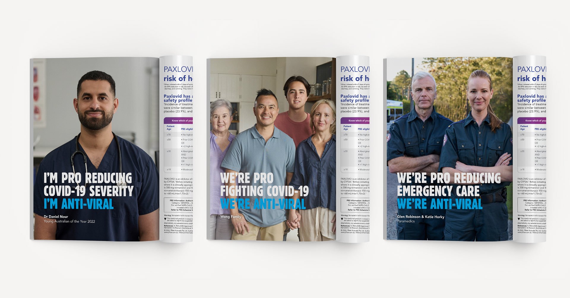 Conducting a public health awareness campaign around COVID-19, Pfizer partnered with trusted, community-minded identities to deliver a public service message through a number of campaign assets. Spearheaded by Ita Buttrose, Dr. Daniel Nour (2022 Young Australian of the Year) and Medical specialists, the campaign urged Australians to ask their GP about anti-viral pills that can help reduce the risk of hospitalisation or serious illness. Aiming to unite all of Australia with a clear public service message delivered from a diversity of perspectives, the multi-channel campaign was featured across TV, Radio, Print, Digital, PR, OOH, and Medical Media.